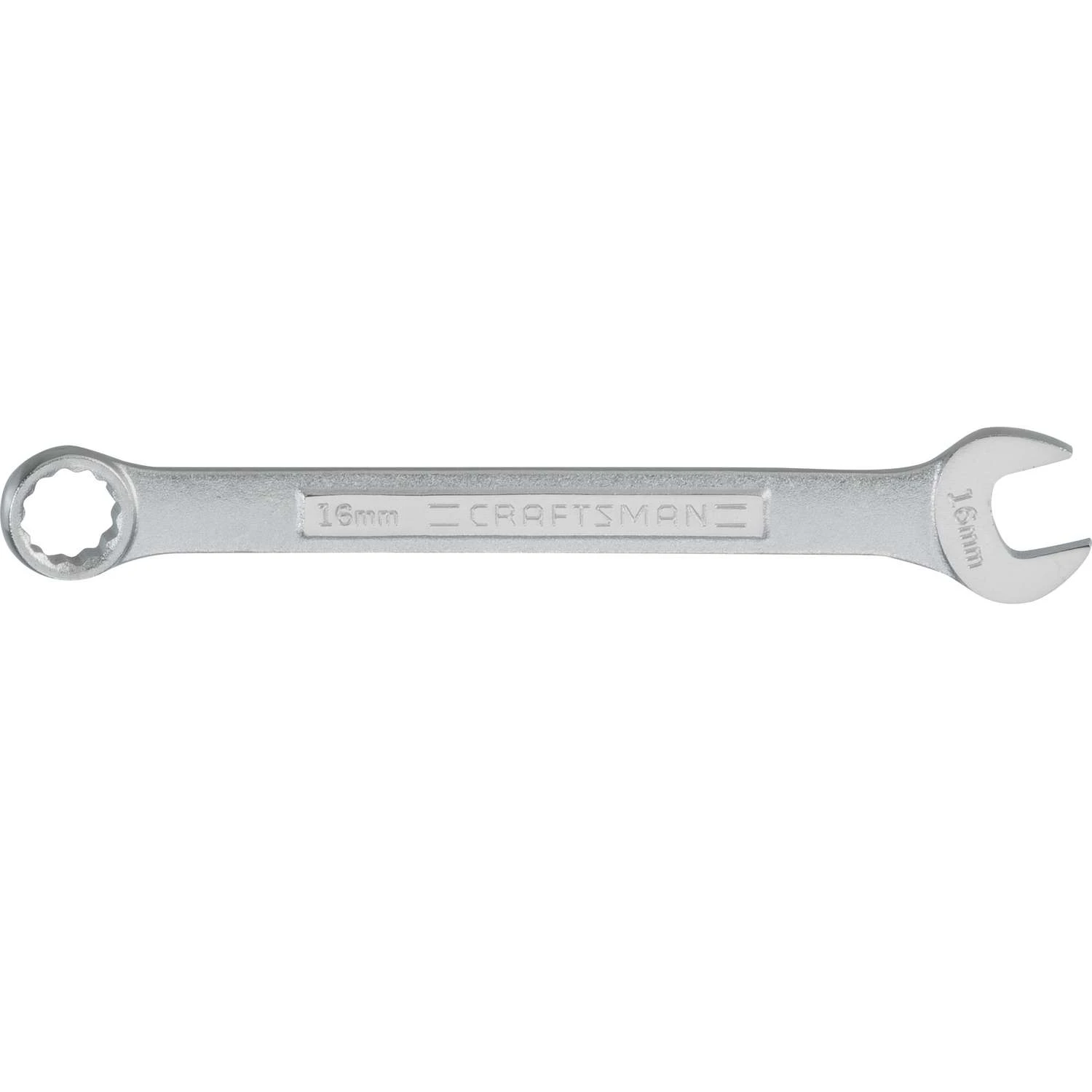 16mm Standard Metric Combination Wrench has a corrosion resistant chrome finish providing extra wear and tear coverage while adding hardness and durability allowing your wrench to last longer. CRAFTSMAN® wrenches meet or exceed ASME specifications. CORROSION RESISTANT: Chrome finish for corrosion resistance QUICK ENGAGEMENT: 12 point box end for quick engagement with fastener KNUCKLE CLEARANCE: 15 box end offset for additional knuckle clearance EASY IDENTIFICATION: Large markings for quick combination wrench identification Meets or Exceeds ASME Specifications