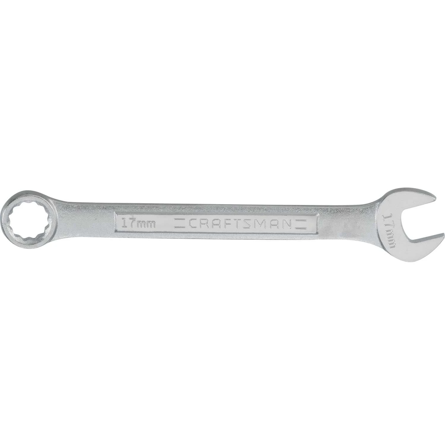 17mm Standard Metric Combination Wrench has a corrosion resistant chrome finish providing extra wear and tear coverage while adding hardness and durability allowing your wrench to last longer. CRAFTSMAN® wrenches meet or exceed ASME specifications. CORROSION RESISTANT: Chrome finish for corrosion resistance QUICK ENGAGEMENT: 12 point box end for quick engagement with fastener KNUCKLE CLEARANCE: 15 box end offset for additional knuckle clearance EASY IDENTIFICATION: Large markings for quick combination wrench identification Meets or Exceeds ASME Specifications