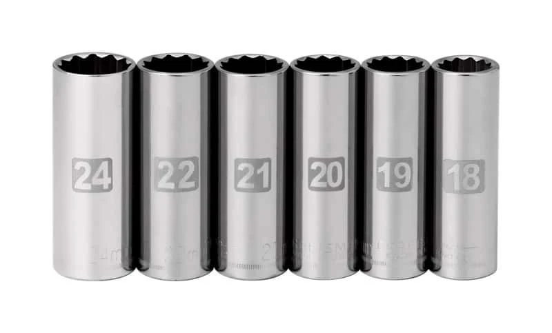 Craftsman 6 metric easy to read socket accessory set 12 point 1/2 drive deep reach includes 18 mm, 19 mm, 20 mm, 21 mm, 22 mm and 24 mm permanent high contrast marking resists chipping and fading excellent for work in low light conditions deep sockets offer additional access to fasteners and are good for working over long bolts. Permanent high contrast marking resists chipping and fading Excellent for work in low light conditions All 12 point sockets Deep sockets offer additional access to fasteners and are good for working over long bolts 1/2 in. size