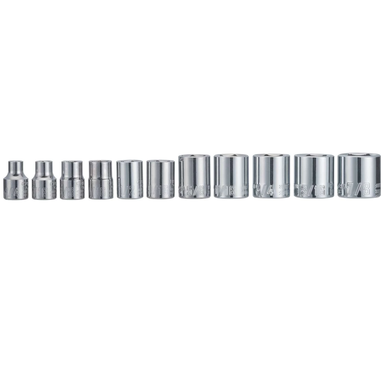 | What's Included | (11) 3/8-in. Drive Shallow 6 PT Sockets SAE – 1/4-in. , 5/16-in. , 3/8-in. , 7/16-in. , 1/2-in. , 9/16-in. , 5/8-in. , 11/16-in. , 3/4-in. , 13/16-in. , 7/8-in. |