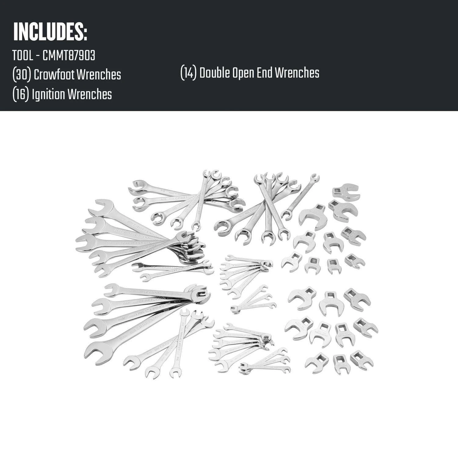 | What's Included | (30) Crowfoot Wrenches, (16) Ignition Wrenches, (14) Double Open End Wrenches |