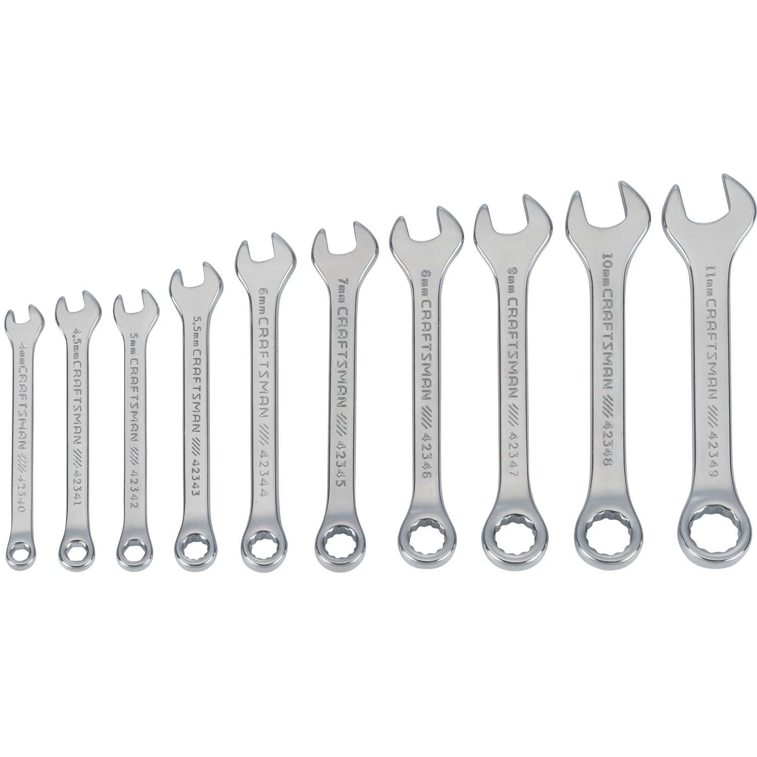 The CRAFTSMAN® 10-piece Metric Miniature Combination Wrench Set includes 10 wrenches, each crafted to feature a miniature combination wrench design. These wrenches are the perfect solution for extremely difficult-to-reach areas. Backed by our CRAFTSMAN Full Lifetime Warranty, this set prioritizes quality and durability over everything else. CORROSION RESISTANCE: Full Polish Chrome Finish QUICK ENGAGEMENT: 12 Point Box End with fastener QUICK SIZE IDENTIFICATION: Large Markings Meets or Exceeds ASME Specifications