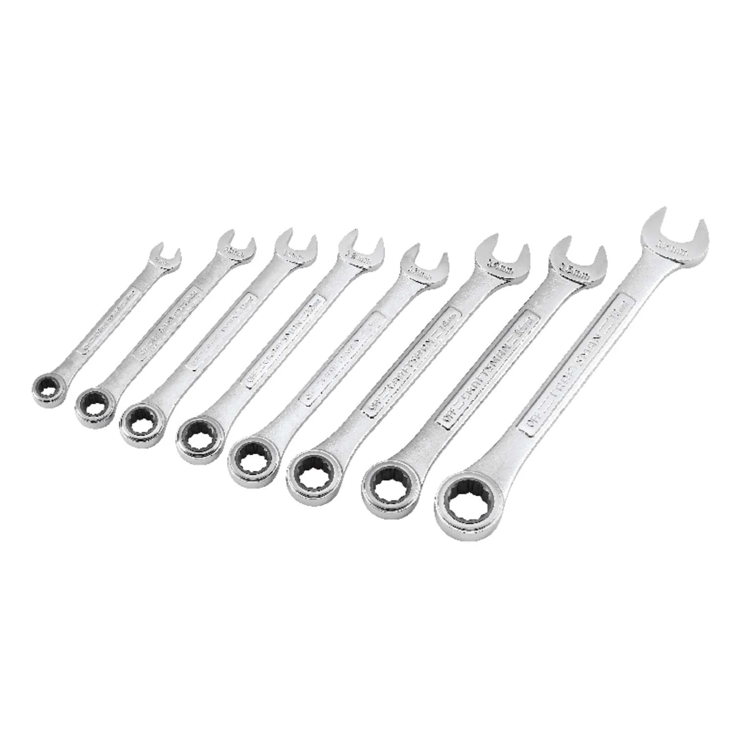 Crafted from high tensile strength alloyed steel and guaranteed forever, this Craftsman 8 piece metric wrench set is a tool box essential you can count on for a lifetime of tough torqueing action. Polished to a shine, each wrench wipes clean easily, helping it resist rust while ensuring size markings are clearly visible so you grab the right tool every time you reach for it. Featuring the combined grip of an open end and the continuous contact of a ratcheting box, this set moves fast to eliminate slip and keep the job moving. Built from tough tested alloyed steel, this 8 piece metric flat wrench set is ready for years of tune-ups, rebuilds and installations well done. Stock your kit with these solid tools and get the job done right, for life. Full polish finish shine bright and cleans-up fast Open end delivers fast grab Ratcheting box end ensures constant contact and rapid turning action Study steel build withstands heavy torqueing Silver, full polish finish Made of alloy steel