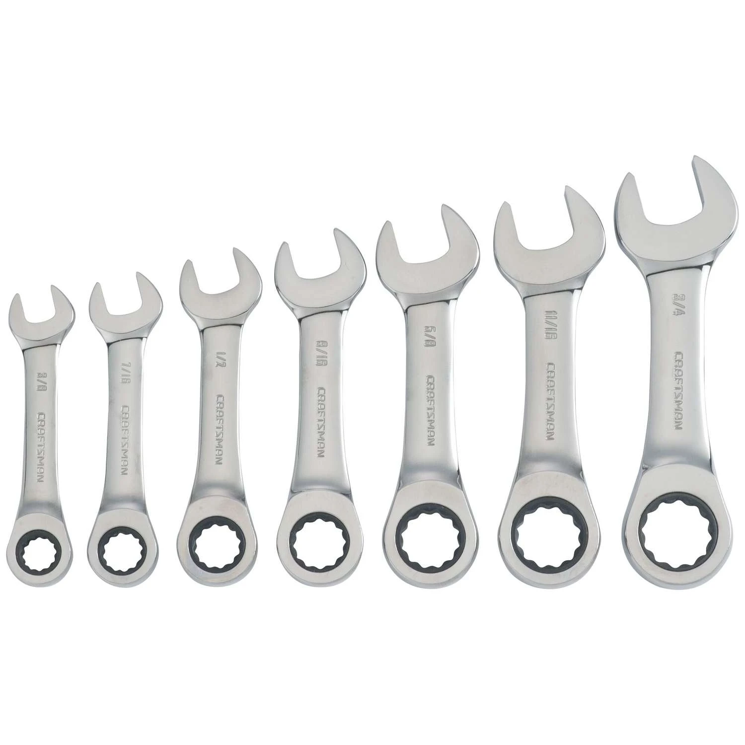 The Craftsman 7 pc. SAE Stubby Ratcheting Combination Wrench Set offers a number of applications from standard bolt turning to specific automotive repairs. CORROSION RESISTANCE: Full-polish chrome finish QUICK ENGAGEMENT: 12-point box makes it easy to engage the fastener ADDITIONAL KNUCKLE CLEARANCE: 15 box end offset ACCESS TO TIGHT SPACES: 72-tooth ratcheting box end helps you get in to hard-to-reach-places QUICK SIZE IDENTIFICATION: Large markings