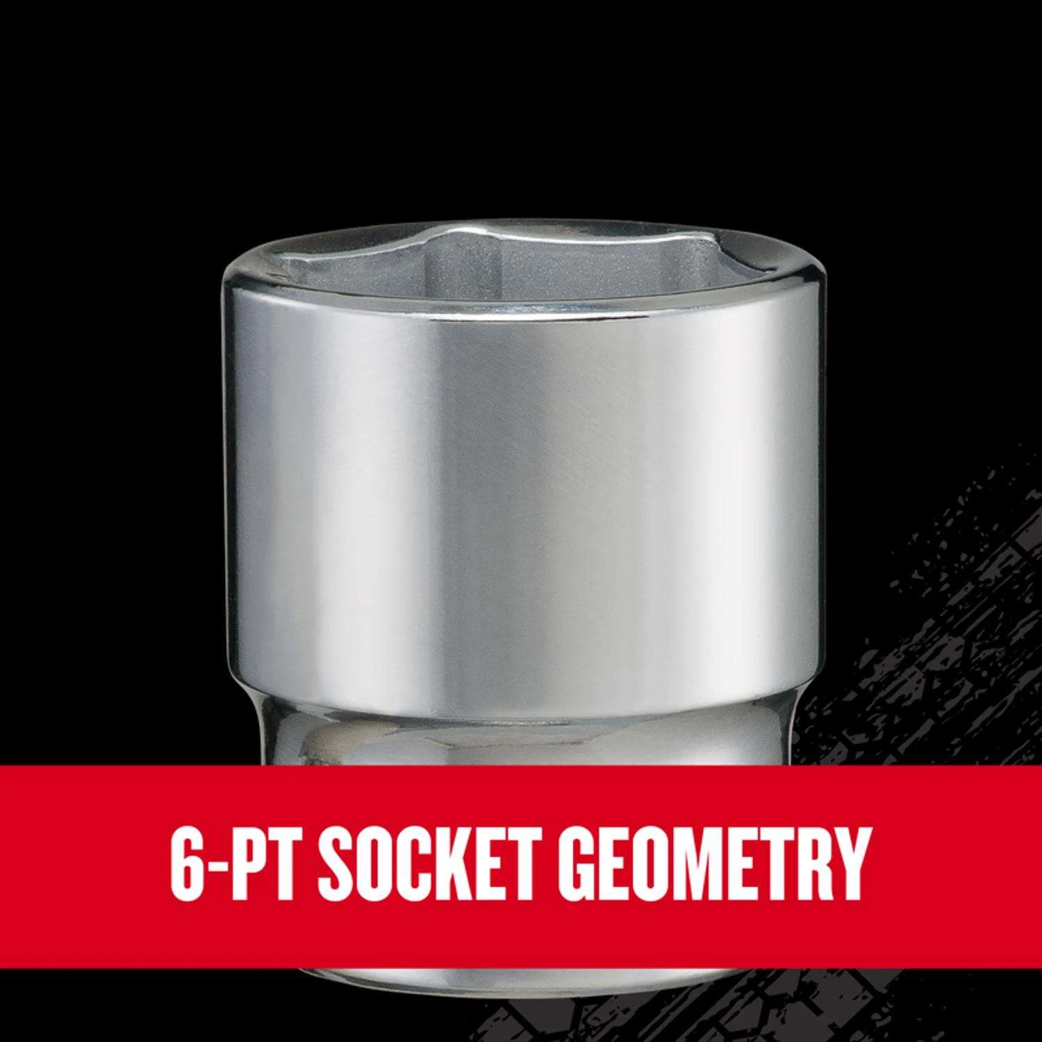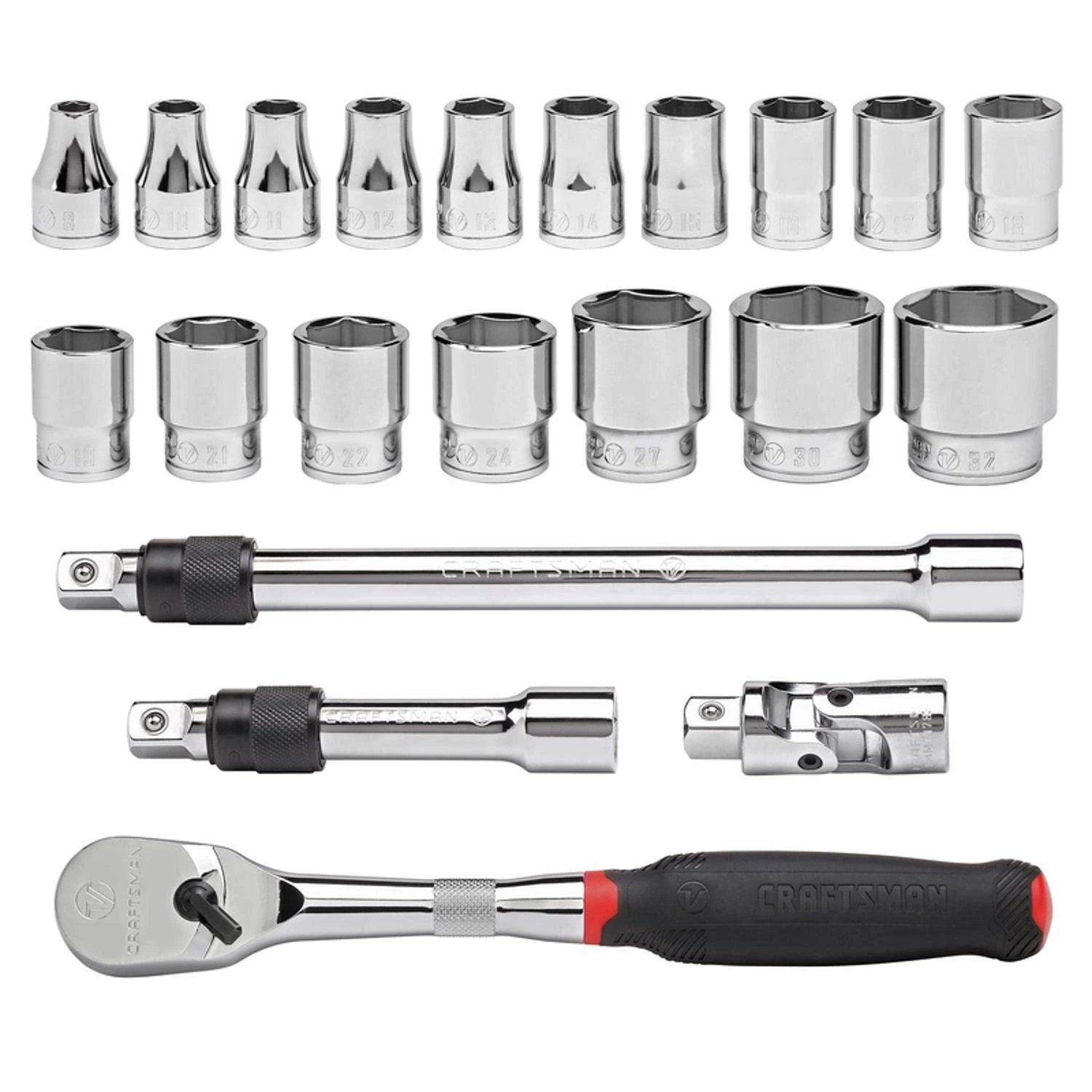 | What's Included | (1) 1/2 in. Drive Bi-Material Ratchet, (17) 1/2 in. Drive 6 Point Shallow Sockets – 8 mm, 10 mm, 11 mm, 12 mm, 13 mm, 14 mm, 15 mm, 16 mm, 17 mm, 18 mm, 19 mm, 21 mm, 22 mm, 24 27 mm, 30 mm and 32 mm, (1) 1/2 in. Drive Universal Joint, (1) 1/2 in. Drive 5 |
