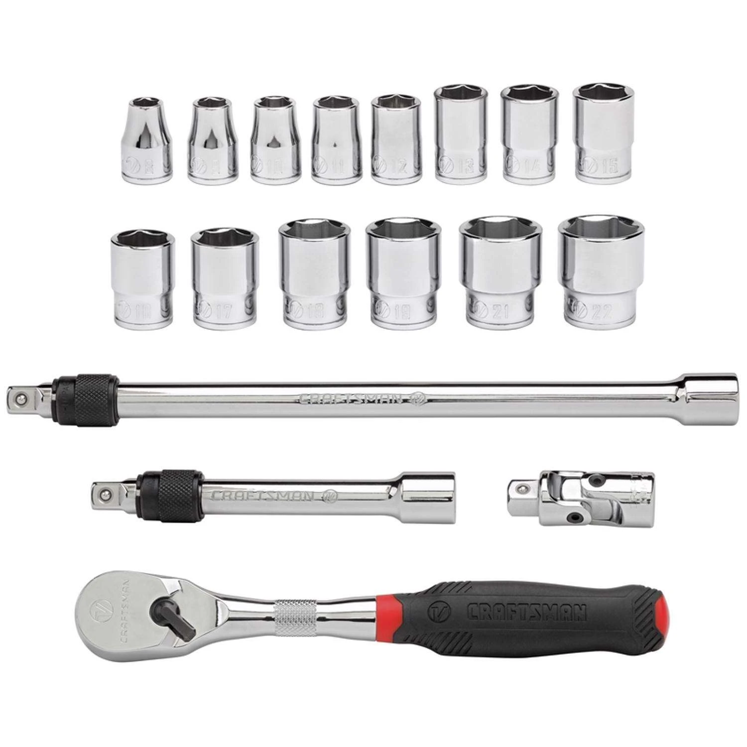 | What's Included | (1) 3/8 in. Drive Bi-Material Ratchet, (14) 3/8 in. Drive 6 Point Shallow Sockets – 8 mm, 9 mm, 10 mm, 11 mm, 12 mm, 13 mm, 14 mm, 15 mm, 16 mm, 17 mm, 18 mm, 19 mm, 21 mm and 22 mm, (1) 3/8 in. Drive Universal Joint, (1) 3/8 in. Drive 5 inch Locking Exte |