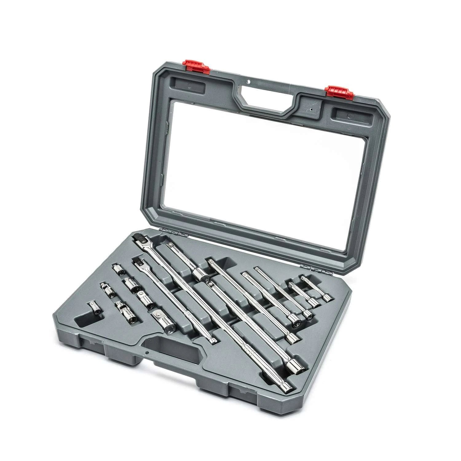 Comprehensive set containing all adapters * needed to do any job * • Includes 18 inch breaker bar * • Breakdown: * – CDTA16 1/4″ U-Joint * – CDTA13 1/2″ x 10″ Extension * – CDTA12 1/2″ x 5″ Extension * – CDTA8 3/8″ DRIVE,3″ EXTENSION * – CDTA9 3/8″ DRIVE,6″ EXTENSION * – CDTA10 3/8″ DRIVE,10″ EXTENSION * – CDTA6 1/4″ X 3″ Extension * – CDTA7 1/4″ x 6″ Extension * – CDTA4 1/2F x 3/4M Adapter * – CDTA3 1/2F x 3/8M Adapter * – CDTA2 3/8F X 1/2M ADAPTER * – CDTA0 1/4F x 3/8M Adapter * – CRW16 1/2″ x 18″ Breaker Bar * – CRW15 3/8″ X 10″ Breaker Bar * – CTDA1 3/8″F * 1/4″M Adapter Covers 1/4 in. To 3/4 in. Drive Sizes High Strength Alloy Steel For Durability Full Polish Chrome To Resist Corrosion Includes All the Adapters Needed For Most Jobs