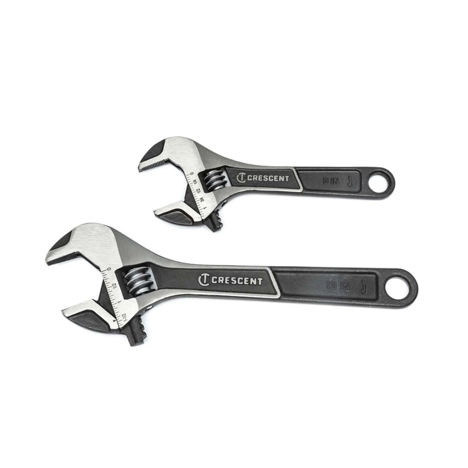 Crescent Wide Jaw Adjustable Wrenches expanded jaw capacity allows for use with a greater range of fastener sizes than traditional adjustable wrenches. Each wrench does the work of the next larger size. Each wrench meets the ASME performance requirements for the next size up (Example: 6 wrench meets the requirements for an 8 wrench) Micro-serrations on the jaws provide a tighter grip on the fastener thus helping to generate 4x more torque than traditional adjustable wrenches Laser etched scale in both SAE and metric sizes allows easy fastener size identification Larger knurl provides a tighter jaw fit, is easier to adjust and is less likely to bind up Black phosphate and lacquer finish help to resist rust and prevent corrosion for better durability