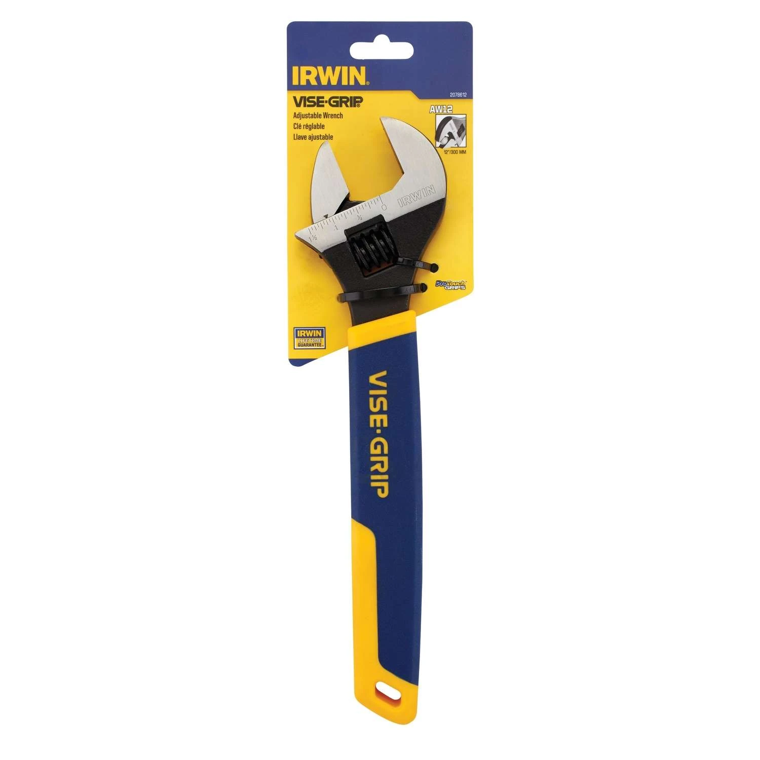 This IRWIN® VISE-GRIP® 12-Inch Adjustable Wrench provides the leverage you need for powerful tightening and loosening applications. Durable chrome vanadium construction ProTouch grips provide extra comfort and reduces hand fatigue English and metric scales Extra wide capacity Hang hole for easy wall storage Meets or exceeds ANSI specifications 12 in.