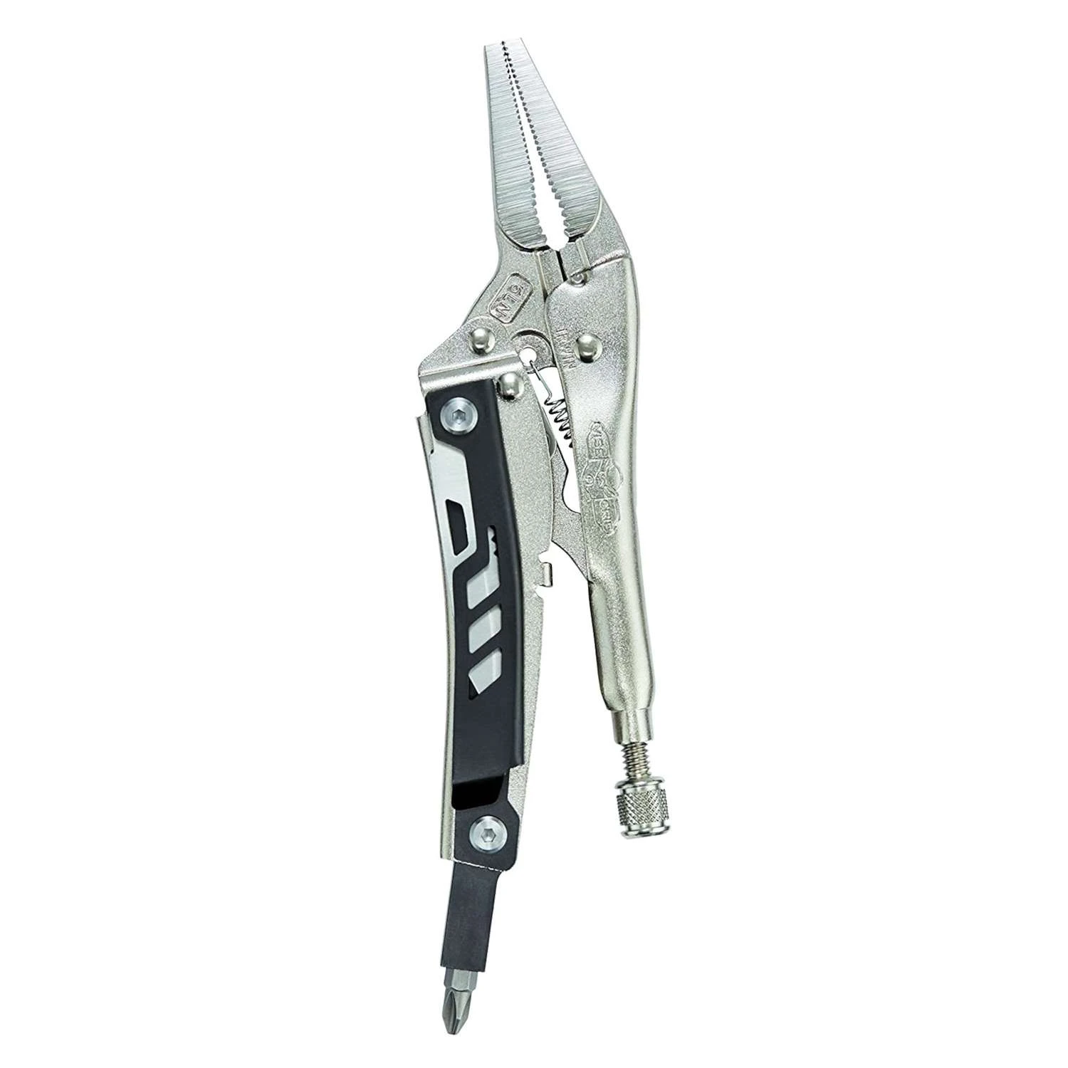 The new IRWIN® VISE-GRIP® 6″ Long Nose Locking Multi-Pliers feature the legendary locking pliers performance tradesmen have trusted since 1924. The 6LN® Locking Multi-Pliers feature a fold-out stainless steel serrated knife blade and a fold-out stainless steel serrated knife bland and a fold-out screwdriver including a ¼” bit holder with 6-8 slotted and #2 Phillips® bits. The four-tools-in-one design allows users to to carry fewer tools on the job. Fold-out Knife: Features a stainless steel blade for convenience Fold-out Screwdriver: Includes a bit holder with 6-8 slotted and #2 Phillips bits Long, straight nose ideal for precision work and hobbies Versatility: Ideal for tightening, clamping, twisting and turning Constructed of high-grade, heat-treated alloy steel Turn screw to adjust pressure and fit work Grip materials from any angle One-handed, triggerless release is easier to open than traditional locking pliers IRWIN Lifetime Guarantee