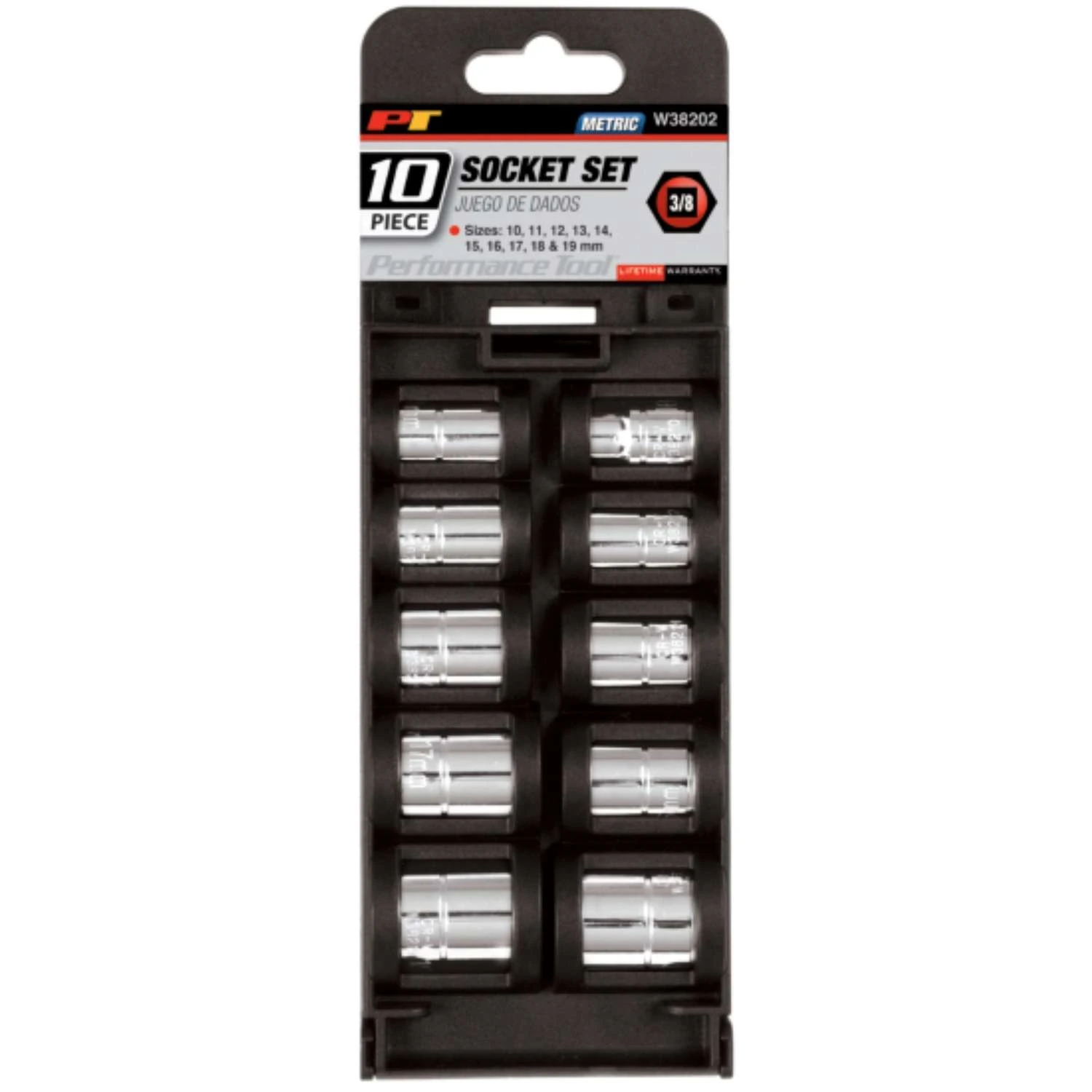 3/8″ Drive Metric Socket Set, 10 Pieces by Performance Tool®. This top-grade product is expertly made in compliance with stringent industry standards to offer a fusion of a well-balanced design and high level of craftsmanship. Manufactured from industry-leading materials using up-to-date equipment, it ensures everlasting reliability and enduring value. This product is distinguished by total quality assurance, unsurpassed by anybody else. Chrome vanadium alloy steel construction for strength and durability Polished nickel chrome plated finish resists corrosion Deep sizes 10, 11, 12, 13, 14, 15, 16, 17, 18 and 19mm Recessed edges