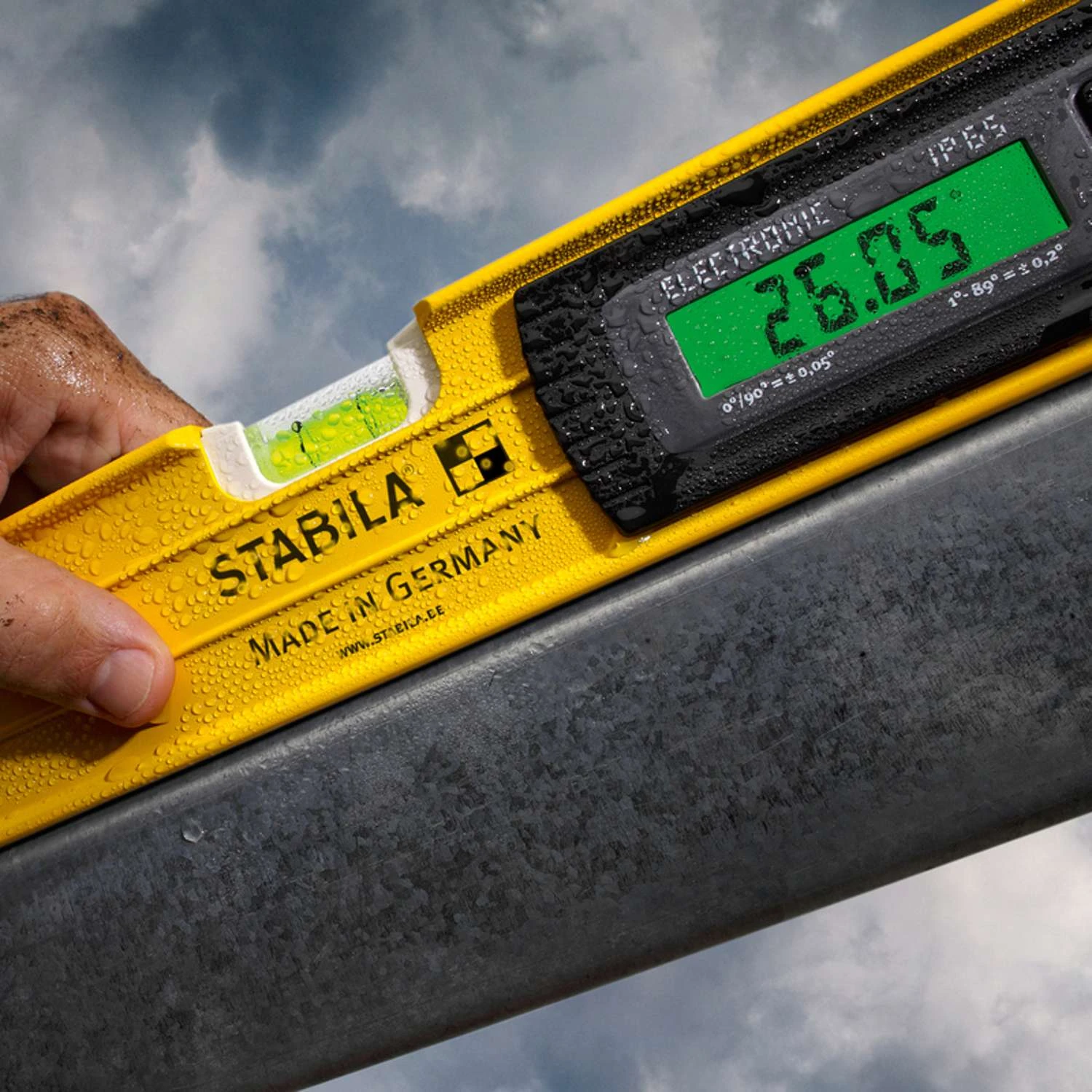 This rugged and practical high-quality level is the choice for any trade that needs to set angles precisely and quickly. If your work is going to be checked, invest in German engineering. The checkers are using Stabila. The electronic measuring technology and precision vials makes work faster and more efficient. The two illuminated digital displays can be read from both the side and the top. It is IP 65 certified therefore fully washable and dustproof. When Stabila designed this electronic level, they added everything you need and then some, making this a tool you can’t do without. Measuring accuracy of the vials in vial up or vial down position 0.029 degrees = 1/32 in over 72 inch/0.5mm/m Electronic accuracy: at 0 degrees and 90 degrees = 0.05 degrees, from 1 degree to 89 degrees = 0.2 degrees IP65 dust and water proof Recalibration of the electronic module is simple and fast with the Stabila vial system Degree, %, rise and run in both inch and metric, display decimal or fractional readings Find plumb and level with sound, hear/listen for spot on as you are making adjustments to the work with shims etc. Displays on the side and top light up and are easily viewed from any position Rib reinforced frame protects the precision vial system and electronic package Impact resistant removable end caps protect the frame
