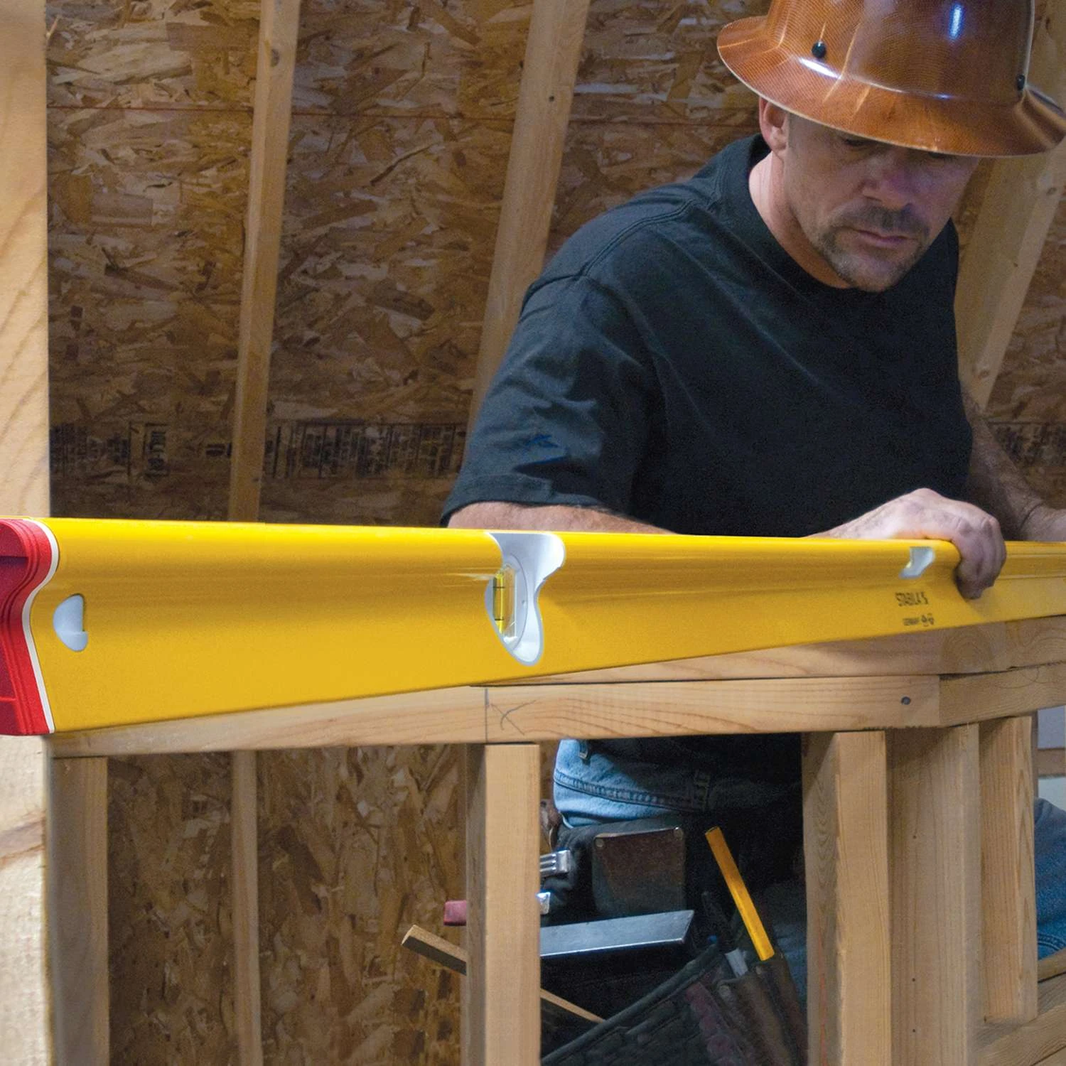 R beams are the most robust spirit level tools that Stabila manufactures. Stabila’s R beams were developed to withstand the toughest worksite conditions. Stabila’s 4 foot R beams feature extremely strong aluminum frames, extra-wide covered measuring surfaces, bridged horizontal vials, removable shock-absorbing end caps with anti-slip wall grips and very accurate matched vials that ensure both plumb readings are the same when leveling in normal and reverse positions. Stabila’s R beams are unlike any other levels on the market. These levels are some of the best products Stabila makes. Completely waterproof Strong, twist resistant frame that has the profile/shape of the letter R Plumb vials are positioned for optimal visibility Wide measuring surface for great stability and grip Three uninterrupted marking, cutting and tracing edges over the full length of the frame The frame fits in the hand like the handrail on stairs The whole length of the level is a continuous hand rail Stabila installation technology ensures long-term accuracy – measuring accuracy in normal and reverse position of 0.5 mm/m ( 1/32 inch over 72 inch) Level will function effectively in extreme temperatures Shock-absorbing rubber end caps – perform like an airbag in your car protecting the frame when the level falls or is dropped